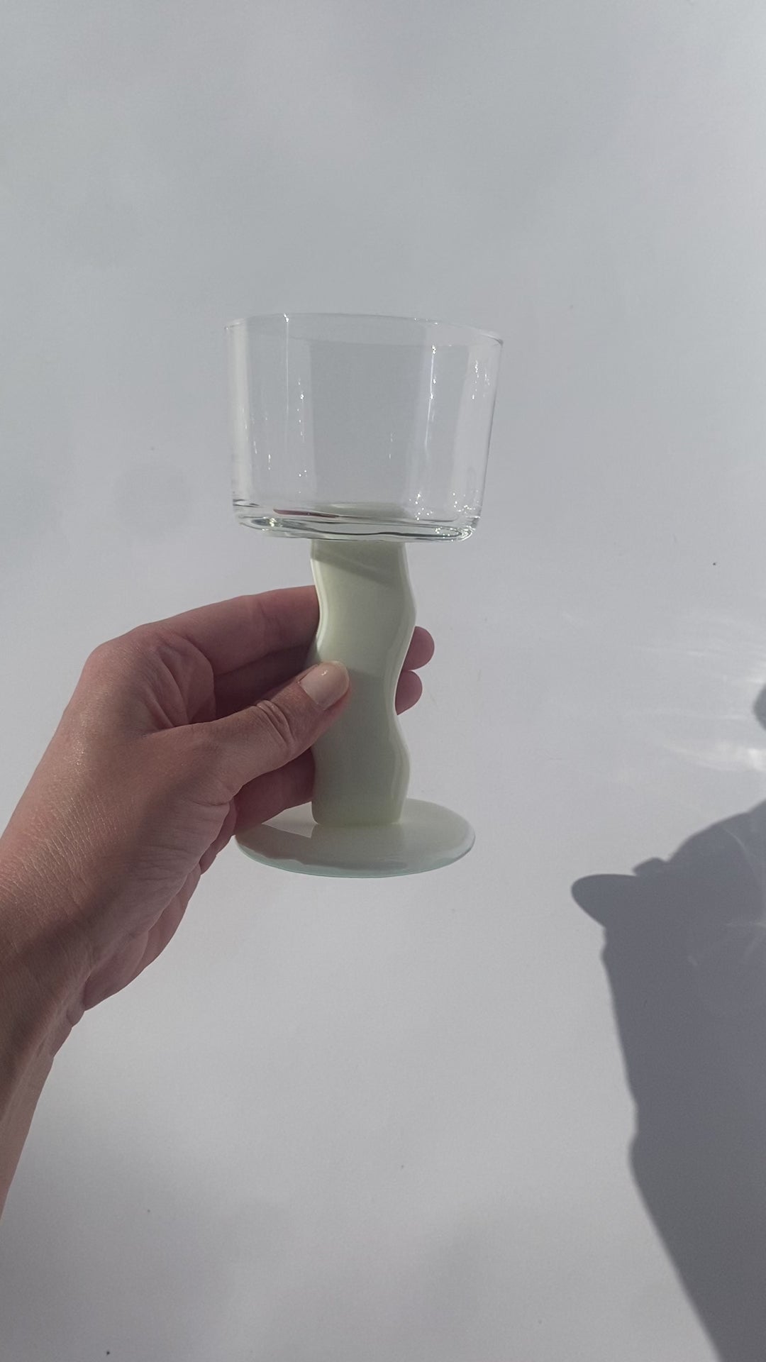 Bring luxury to your home bar and elevate your favorite drink with this unique, sculptural vanilla white wavy stem glass piece—handmade using the technique of glass fusion from our small art glass studio, Dot.